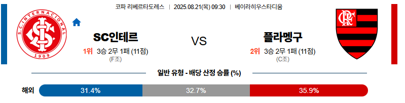 인터나시오날은 홈 이점을 바탕으로 압박 강도와 경기 템포를 극대화할 수 있습니다. 반면 플라멩고는 원정에서 압박 약화와 후반 집중력 저하로 흔들릴 가능성이 있습니다. 이번 경기는 절박한 반전 의지를 앞세운 인터나시오날이 반드시 잡아내야 할 무대입니다.