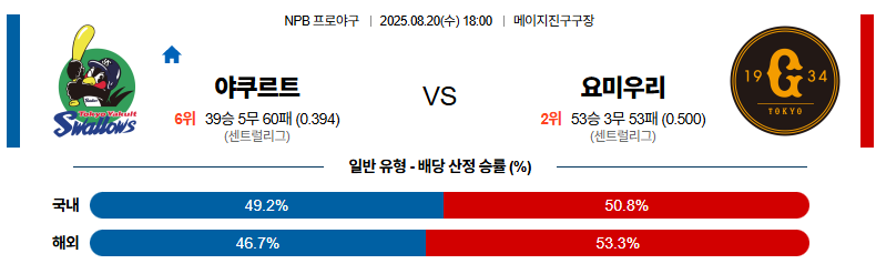 야쿠르트 대 요미우리 NPB 08월20일 맞대결 생중계, 스포츠중계, 스포츠분석