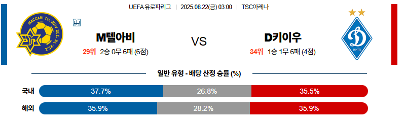 텔아비브 대 디나모키이우 UEFA유로파리그 08월22일 맞대결 생중계, 스포츠중계, 스포츠분석