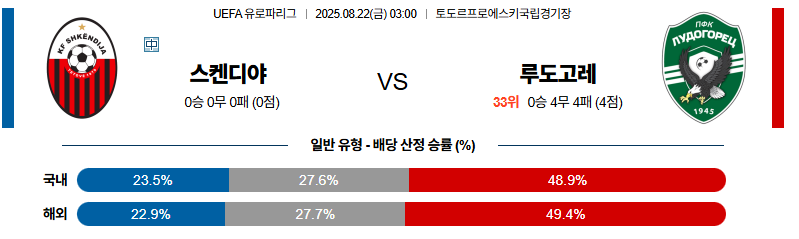 슈켄디야 대 루도고레츠 UEFA유로파리그 08월22일 맞대결 생중계, 스포츠중계, 스포츠분석