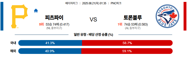 피츠버그 대 토론토 MLB 08월21일 맞대결 생중계, 스포츠중계, 스포츠분석