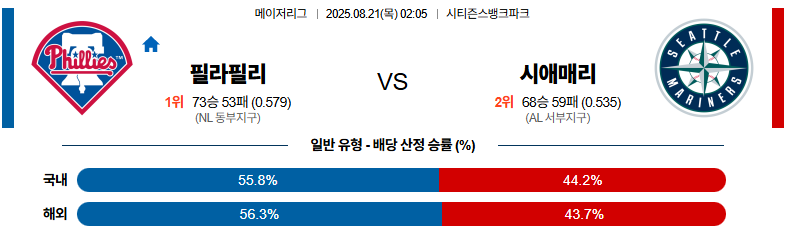 필라델피아 대 시애틀 MLB 08월21일 맞대결 생중계, 스포츠중계, 스포츠분석