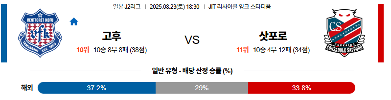 반포레고후 대 삿포로 J리그2 08월23일 맞대결 생중계, 스포츠중계, 스포츠분석