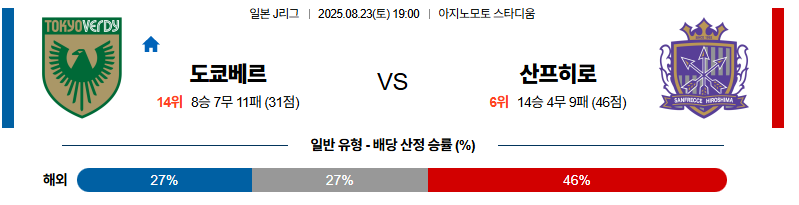 도쿄베르디 대 산프레체히로시마 J리그1 08월23일 맞대결 생중계, 스포츠중계, 스포츠분석