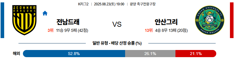 전남 대 안산 K리그2 08월23일 맞대결 생중계, 스포츠중계, 스포츠분석