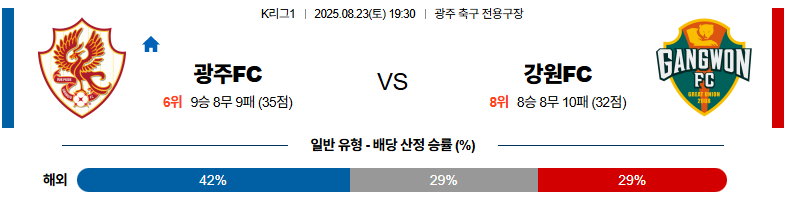 광주가 홈에서 강원의 빌드업을 압박하며 경기를 주도할 가능성이 높습니다. 강원은 역습 속도는 있지만 전환 과정에서의 불안이 실점 위험을 키우고 있어, 광주가 승리할 것으로 보입니다.