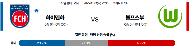 하이덴하임 대 볼프스부르크 분데스리가 08월23일 맞대결 생중계, 스포츠중계, 스포츠분석
