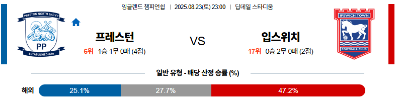 프레스턴 대 입스위치 잉글랜드챔피언쉽 08월23일 맞대결 생중계, 스포츠중계, 스포츠분석
