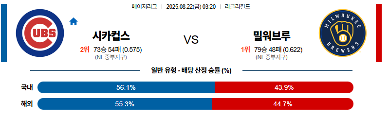 시카고컵스 대 밀워키 MLB 08월22일 맞대결 생중계, 스포츠중계, 스포츠분석