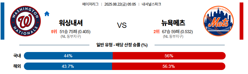 워싱턴 대 뉴욕메츠 MLB 08월22일 맞대결 생중계, 스포츠중계, 스포츠분석