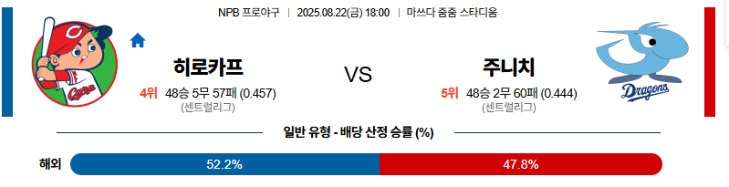 히로시마 대 주니치 NPB 08월22일 맞대결 생중계, 스포츠중계, 스포츠분석
