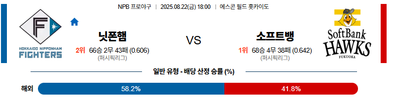 니혼햄 대 소프트뱅크 NPB 08월22일 맞대결 생중계, 스포츠중계, 스포츠분석