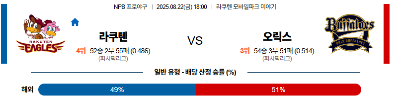 라쿠텐 대 오릭스 NPB 08월22일 맞대결 생중계, 스포츠중계, 스포츠분석