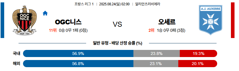 OGC니스 대 오세르 리그앙 08월24일 맞대결 생중계, 스포츠중계, 스포츠분석