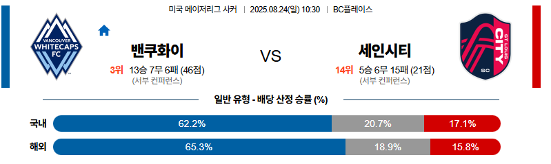 밴쿠버화이트캡스 대 세인트루이스 메이저리그사커 08월24일 맞대결 생중계, 스포츠중계, 스포츠분석