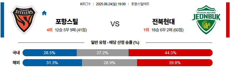 포항스틸러스 대 전북현대 K리그1 08월24일 맞대결 생중계, 스포츠중계, 스포츠분석