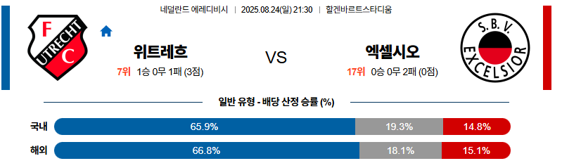 위트레흐트 대 엑셀시오르 에레디비지 08월24일 맞대결 생중계, 스포츠중계, 스포츠분석