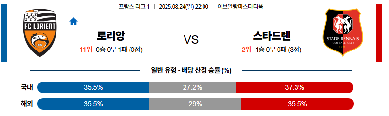 렌은 첫 경기에서 마르세유를 상대로 승리를 따내며 산뜻한 출발을 했습니다. 하지만 전력에 있어 부상과 징계의 이슈가 상당합니다. 알리두 세이두가 장기 부상으로 이탈한 데다가, 릴리앙 브라시에와 크리스토퍼 우가 차례로 빠졌고, 아이트 부들랄은 퇴장으로 징계까지 받아 이번 경기 수비 라인에 큰 공백이 발생하고 있습니다. 이로 인해 원정 경기에서 수비력이 흔들릴 가능성이 적지 않습니다. 그럼에도 루도비크 블라스가 개막전에서 결승골을 기록하며 팀의 에이스로서 확실히 자리 잡았고, 세코 포파나와 무사 알타마리 역시 중원과 측면에서 활발한 움직임을 보였습니다. 렌은 높은 전진 압박과 짧은 패스로 중앙을 장악하는 전술을 즐겨 사용하며 경기의 주도권을 빼앗지 않으려 합니다. 또한 좌측을 중심으로 한 빠른 변속 플레이와 측면을 활용한 공격 기회를 자주 만들어내며, 이는 로리앙과 같은 저블록 수비 팀을 상대할 때 더욱 빛을 발합니다. 다만 다수 수비수들의 부재는 결과적으로 상대 역습에 취약함을 만들 수 있고, 이는 로리앙에게도 희망적인 요소입니다.