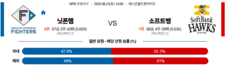 니혼햄 대 소프트뱅크 NPB 08월23일 맞대결 생중계, 스포츠중계, 스포츠분석