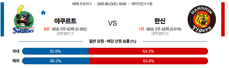 야쿠르트 대 한신 NPB 08월23일 맞대결 생중계, 스포츠중계, 스포츠분석