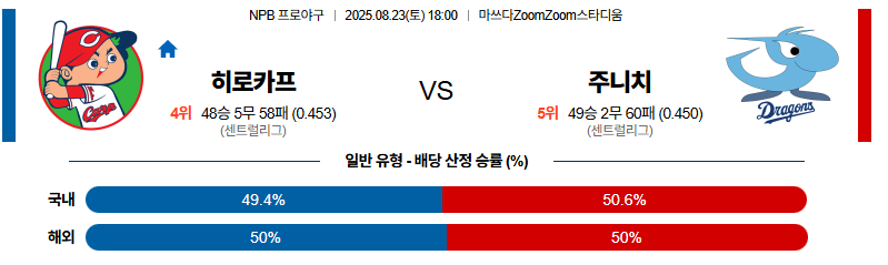 히로시마 대 주니치 NPB 08월23일 맞대결 생중계, 스포츠중계, 스포츠분석