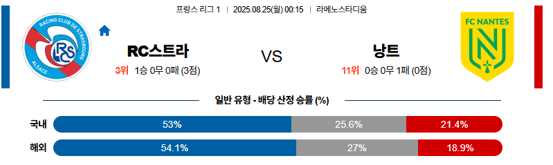 스트라스부르 대 낭트 리그앙 08월25일 맞대결 생중계, 스포츠중계, 스포츠분석