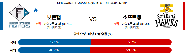 니혼햄 대 소프트뱅크 NPB 08월24일 맞대결 생중계, 스포츠중계, 스포츠분석