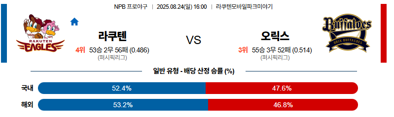 라쿠텐 대 오릭스 NPB 08월24일 맞대결 생중계, 스포츠중계, 스포츠분석