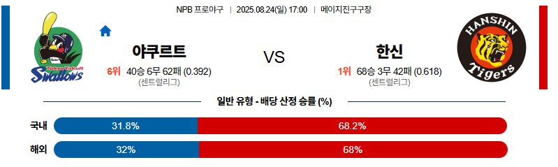 야쿠르트 대 한신 NPB 08월24일 맞대결 생중계, 스포츠중계, 스포츠분석