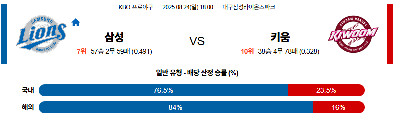 삼성 대 키움 KBO 08월24일 맞대결 생중계, 스포츠중계, 스포츠분석