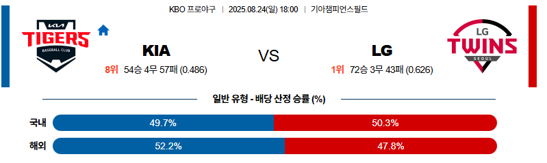 KIA 대 LG KBO 08월24일 맞대결 생중계, 스포츠중계, 스포츠분석