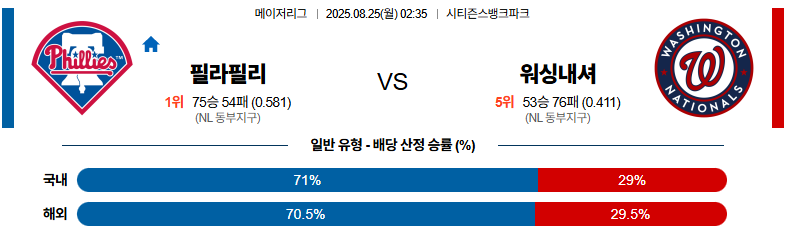 필라델피아 대 워싱턴 MLB 08월25일 맞대결 생중계, 스포츠중계, 스포츠분석