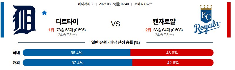 디트로이트 대 캔자스시티 MLB 08월25일 맞대결 생중계, 스포츠중계, 스포츠분석