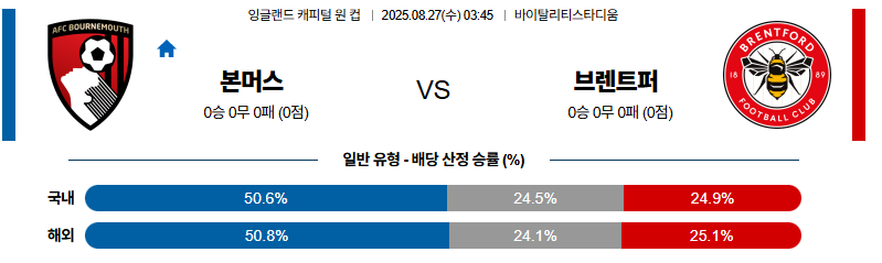 본머스 대 브렌트퍼드 잉글랜드캐피털원컵 08월27일 맞대결 생중계, 스포츠중계, 스포츠분석