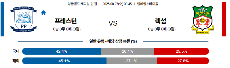 프레스턴 대 렉섬 잉글랜드캐피털원컵 08월27일 맞대결 생중계, 스포츠중계, 스포츠분석