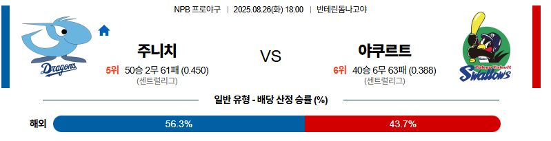 주니치 대 야쿠르트 NPB 08월26일 맞대결 생중계, 스포츠중계, 스포츠분석