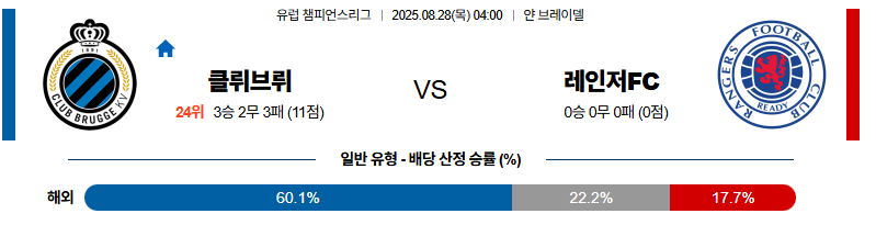 브뤼헤 대 레인저스 UEFA챔피언스리그 08월28일 맞대결 생중계, 스포츠중계, 스포츠분석
