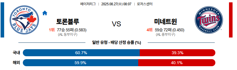 토론토 대 미네소타 MLB 08월27일 맞대결 생중계, 스포츠중계, 스포츠분석