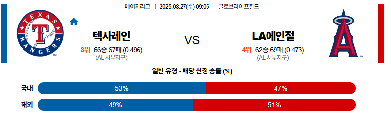 텍사스 대 LA에인절스 MLB 08월27일 맞대결 생중계, 스포츠중계, 스포츠분석