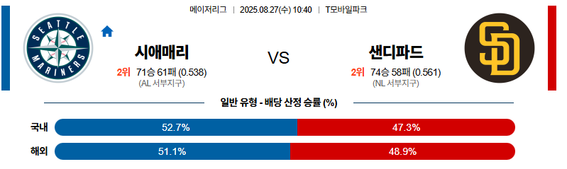 시애틀 대 샌디에이고 MLB 08월27일 맞대결 생중계, 스포츠중계, 스포츠분석