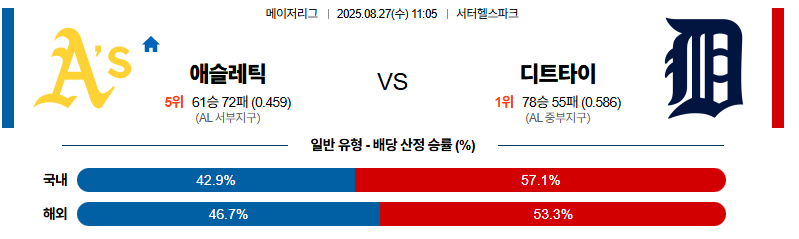 애슬레틱스 대 디트로이트 MLB 08월27일 맞대결 생중계, 스포츠중계, 스포츠분석