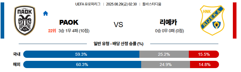 이번 UEFA 유로파리그 PO 2차전에서는 PAOK가 특유의 조직적 수비와 안정된 중원 압박, 그리고 측면에서의 활발한 오버래핑을 통해 리예카의 역습 기회를 차단하며 수비에 무게를 두는 경기 운영이 예상됩니다. 리예카가 역습과 중거리로 실마리를 찾으려 하겠으나, PAOK의 홈 수비와 미드필더진 결속력이 해당 위기 상황을 잘 통제할 것입니다. 경기 내내 핵심 자원의 컨디션이 정상임을 바탕으로, 최종적으로 PAOK의 1-0 승리를 예상합니다.