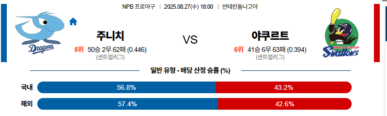 주니치 대 야쿠르트 NPB 08월27일 맞대결 생중계, 스포츠중계, 스포츠분석