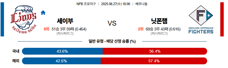 세이부 대 니혼햄 NPB 08월27일 맞대결 생중계, 스포츠중계, 스포츠분석