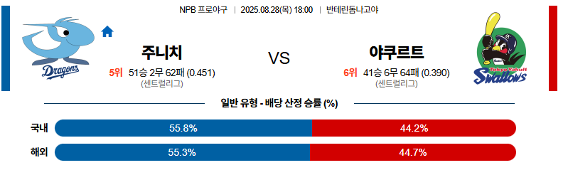 주니치 대 야쿠르트 NPB 08월28일 맞대결 생중계, 스포츠중계, 스포츠분석