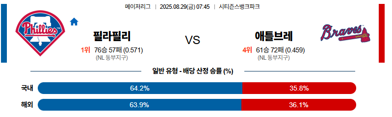 필라델피아 대 애틀랜타 MLB 08월29일 맞대결 생중계, 스포츠중계, 스포츠분석