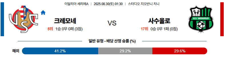 크레모네 대 사수올로 세리에A 08월30일 맞대결 생중계, 스포츠중계, 스포츠분석