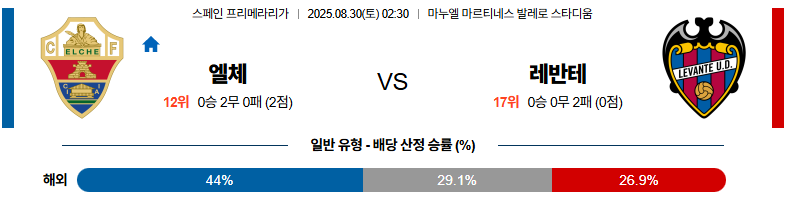 엘체 대 레반테 라리가 08월30일 맞대결 생중계, 스포츠중계, 스포츠분석