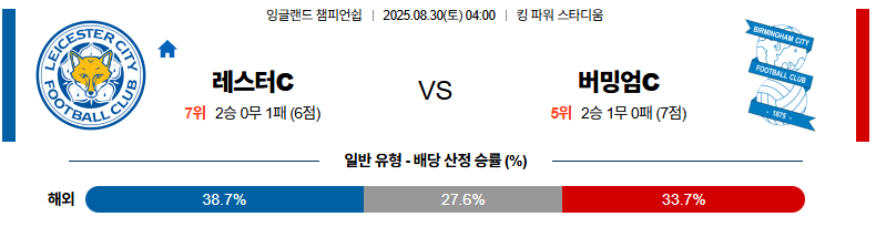 레스터시티 대 버밍엄시티 잉글랜드챔피언쉽 08월30일 맞대결 생중계, 스포츠중계, 스포츠분석