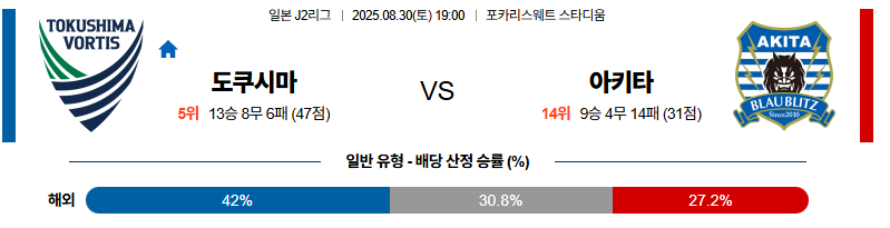 도쿠시마 대 아키타 J리그2 08월30일 맞대결 생중계, 스포츠중계, 스포츠분석